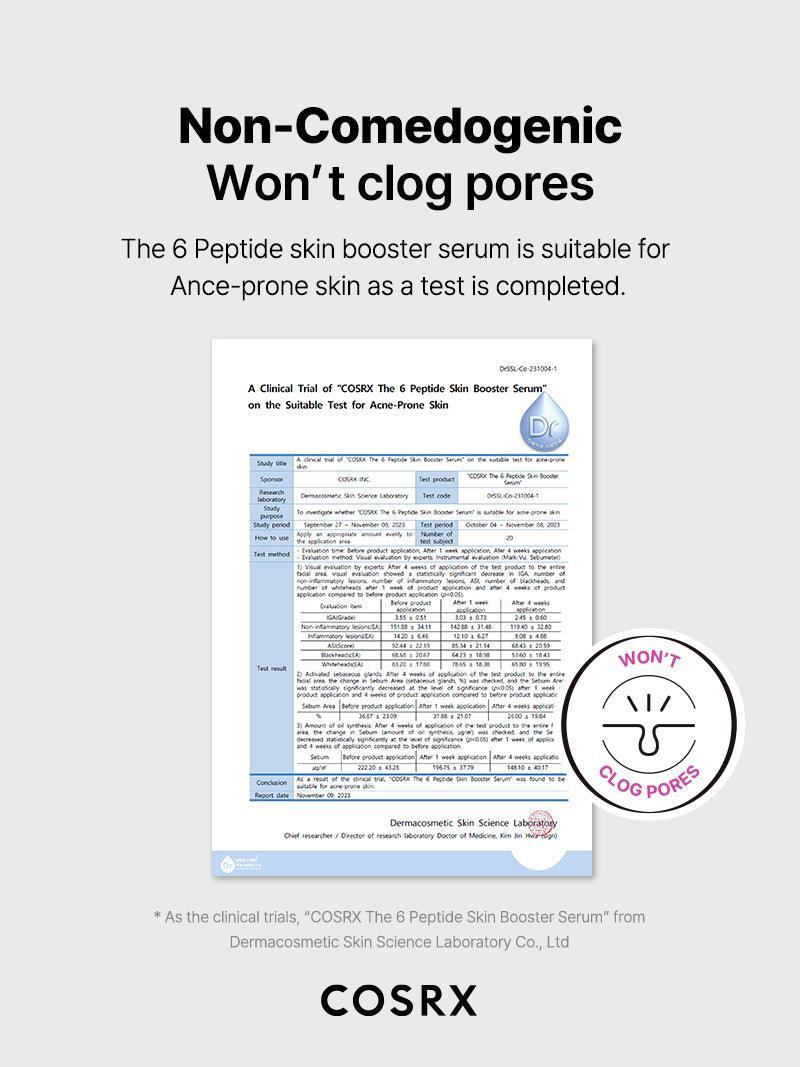 The 6 peptide skin booster contains 6 multi peptides that boost overall skin condition such as pore & sebum, firmness, fine lines, skin texture, skin tone and soothing. It is perfect to use as the first step of skincare routine to prep and boost.